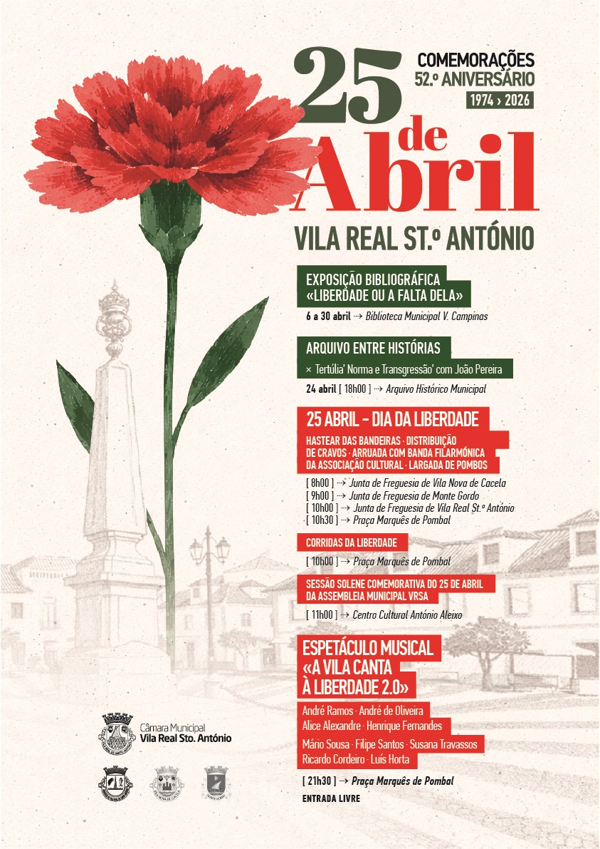 O Município de Vila Real de Santo António assinala o 52.º aniversário do 25 de Abril com um conjunto de iniciativas organizadas em colaboração com as Juntas de Freguesia do concelho.