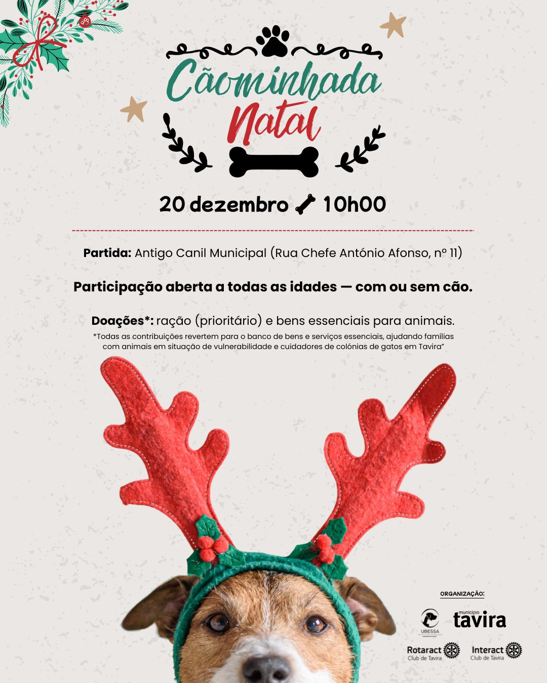 Em Tavira, no dia 20 de dezembro, às 10h00, realiza-se a Cãominhada de Natal, uma iniciativa solidária que promove o bem-estar animal, a adoção responsável e o convívio entre a comunidade e os seus animais de companhia.