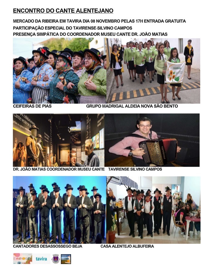 A Associação dos Amigos do Alentejo de Tavira, vai levar a efeito no dia 8 de novembro, pelas 17h00, no Mercado da Ribeira, o Encontro do Cante Alentejano.