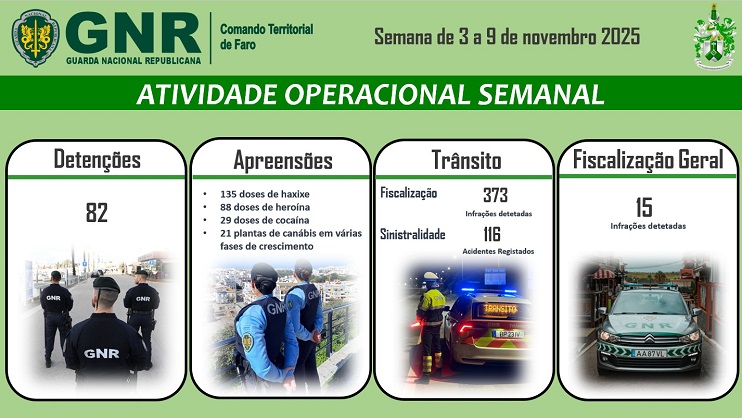 O Comando Territorial de Faro da Guarda Nacional Republicana levou a efeito um conjunto de operações no distrito de Faro, na semana de 3 a 9 de novembro, que visaram a prevenção e o combate à criminalidade violenta, fiscalização rodoviária, entre outras, registando os seguintes dados operacionais: