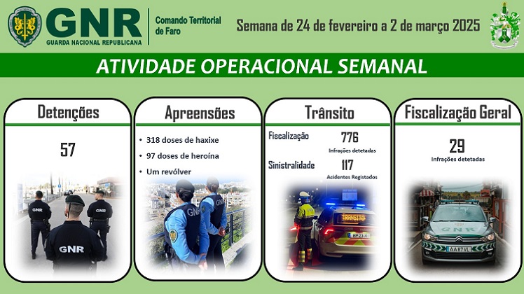 O Comando Territorial de Faro da Guarda Nacional Republicana levou a efeito um conjunto de operações no distrito de Faro, na semana de 24 de fevereiro a 2 de março, que visaram a prevenção e o combate à criminalidade violenta, fiscalização rodoviária, entre outras, registando os seguintes dados operacionais: