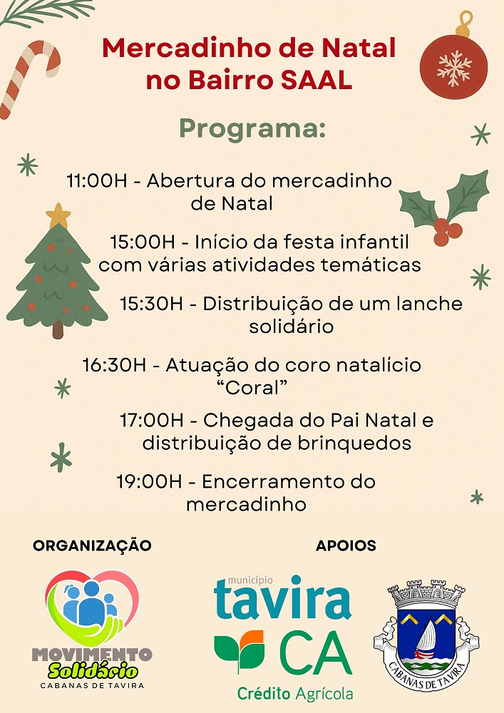 A Junta de Freguesia divulga o Mercadinho de Natal no Bairro SAAL, uma iniciativa organizada pela Associação Akiparasi – Movimento Solidário Cabanas de Tavira, que conta com o apoio da Junta de Freguesia de Cabanas de Tavira!