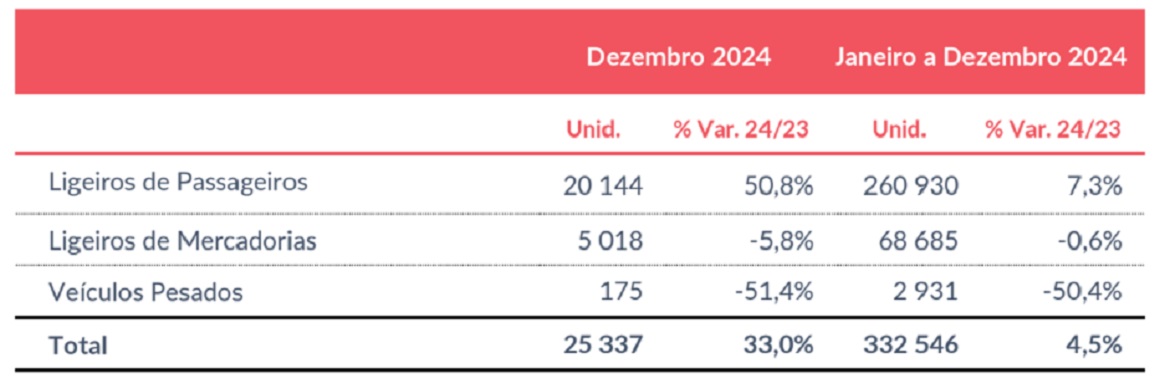 A esmagadora maioria, mais de 20 mil, foram automóveis ligeiros de passageiros, segmento que cresceu 7,3% em 2024. Pelo contrário, os segmentos de ligeiros de mercadorias e de veículos pesados registaram quedas de, respetivamente, 0,6% e 50,4%.