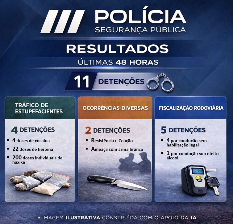 Nas últimas 48 horas, a PSP de Faro deteve 11 suspeitos por diferentes crimes nas cidades de Portimão, Tavira, Faro e Lagos.
