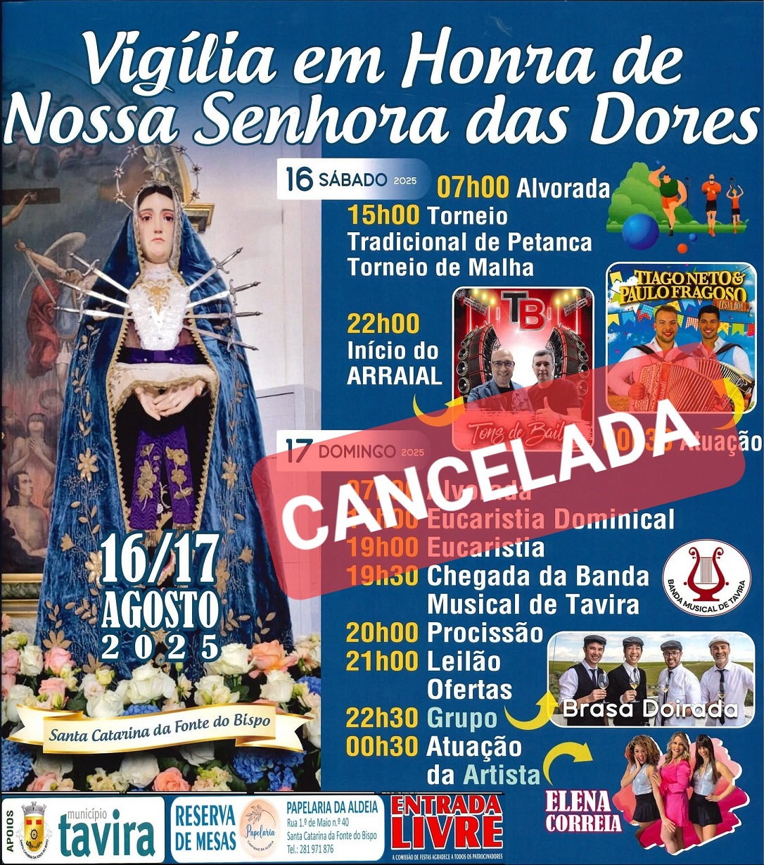 «É com grande tristeza e muito pesar, num momento ímpar de dor, que a Comissão de Festas em Honra à Nossa Senhora das Dores de Santa Catarina da Fonte do Bispo informa a todos: