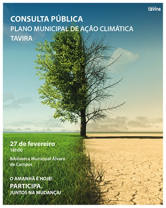 Em Tavira, no dia 27 de fevereiro, pelas 18h00, decorre, na Biblioteca Municipal Álvaro de Campos, a apresentação do Plano Municipal de Ação Climática, decorrente da consulta pública que se inicia hoje e decorrerá até 08 de abril.