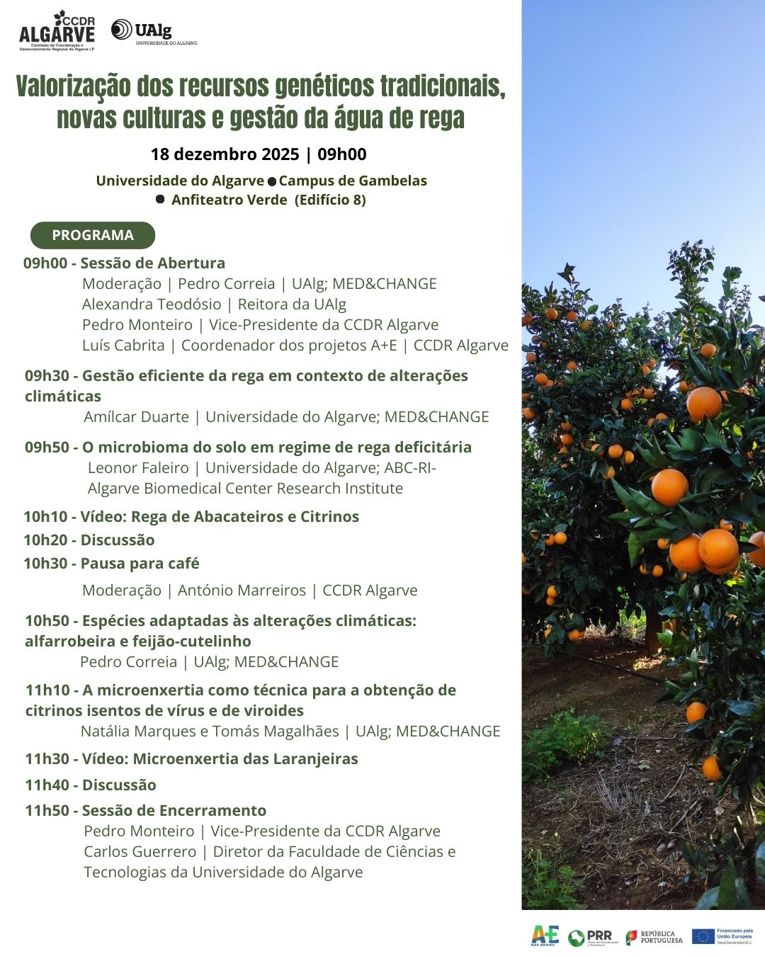 A sessão conta com a participação de investigadores da Universidade do Algarve, no âmbito do programa MED&CHANGE, e de responsáveis da CCDR Algarve, reforçando a ligação entre ciência, inovação e aplicação prática no setor agrícola regional.