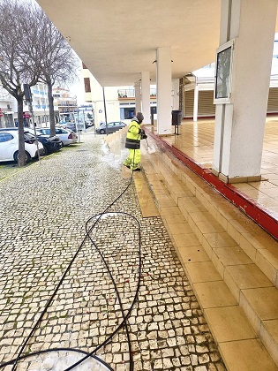 À semelhança da intervenção realizada em Vila Real de Santo António, foram utilizados lava-ruas com sistema de aspiração de águas sujas e varredoras mecânicas equipadas com escovas mistas e pistola de água de alta pressão.