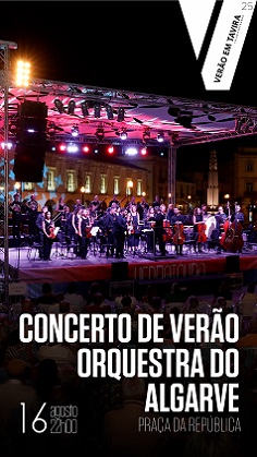 Em Tavira, no dia 16 de agosto, pelas 22h00, na Praça da República, realiza-se o concerto de verão da Orquestra do Algarve, sob a direção do Maestro Martim Sousa Tavares.