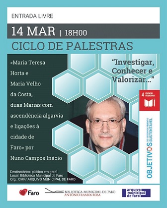 Nuno Campos Inácio, autor do portal «Genealogia do Algarve» vai proferir uma palestra na Biblioteca Municipal de Faro, neste dia 14 de março, pelas 18 horas, com a temática «Maria Teresa Horta e Maria Velho da Costa, duas Maria