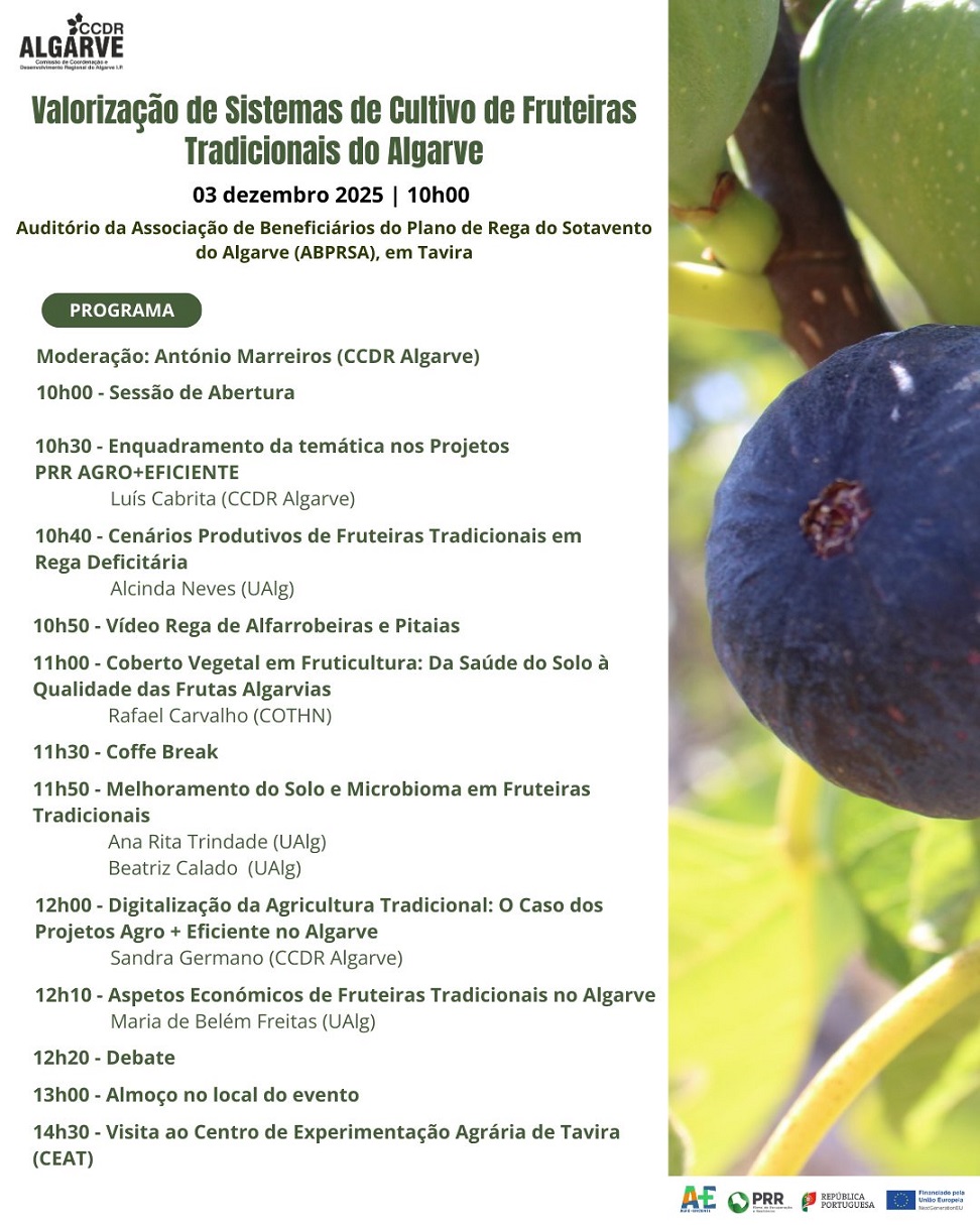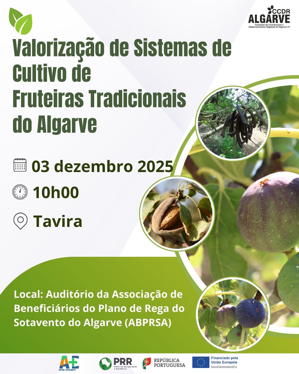 A CCDR Algarve, I.P. promove uma sessão dedicada à Valorização de Sistemas de Cultivo de Fruteiras Tradicionais do Algarve, no âmbito do projeto Agro + Eficiente (A+E), do PRR.