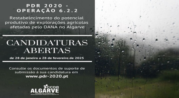 Até ao próximo dia 28 de fevereiro está aberto o aviso para a submissão de candidaturas ao PDR2020 para apoios ao restabelecimento do potencial produtivo de explorações agrícolas, danificado no seguimento dos fenómenos meteorológicos Kirk e DANA (Depressão Atmosférica em Níveis Altos), bem como da doença Língua Azul, reconhecida como catástrofe natural [Despacho n.º 1219/2025, de 27 de janeiro] (https://diariodarepublica.pt/dr/detalhe/despacho/1219-c-2025-905119996).