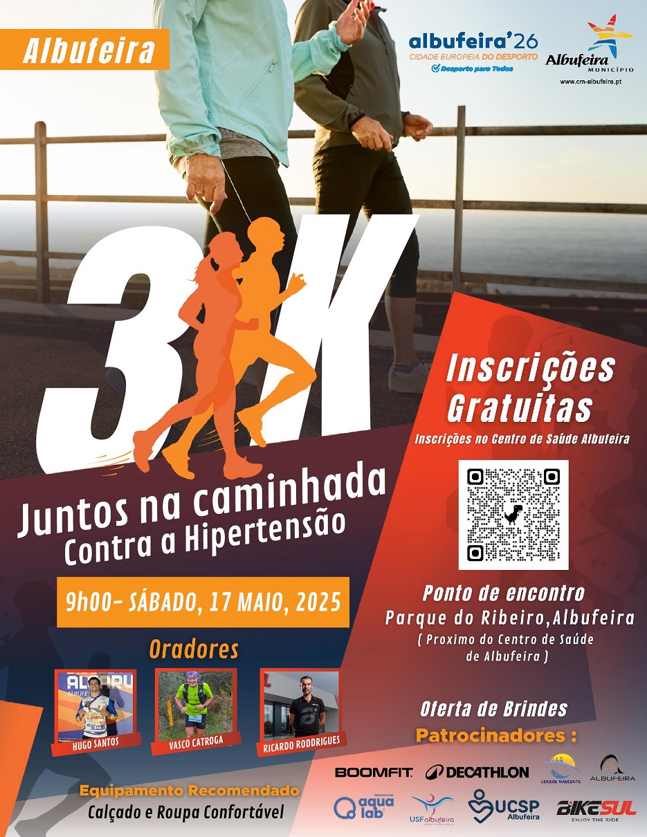 No próximo dia 17 de maio (sábado), a partir das 09h00, realiza-se em Albufeira a atividade desportiva “Juntos na Caminhada contra a Hipertensão”. A iniciativa, organizada pelas três unidades dos Cuidados de Saúde Primários de Albufeira em parceria com o Município, decorre no Dia Mundial da Hipertensão e tem por objetivo sensibilizar a comunidade sobre a importância da atividade física na prevenção da doença e promoção da saúde e do bem-estar. Para além da caminhada, o programa inclui atividades interativas, jogos e palestras e a entrega de brindes aos participantes. As inscrições são gratuitas e estão a decorrer no Centro de Saúde de Albufeira. Inscreva-se pela sua Saúde!