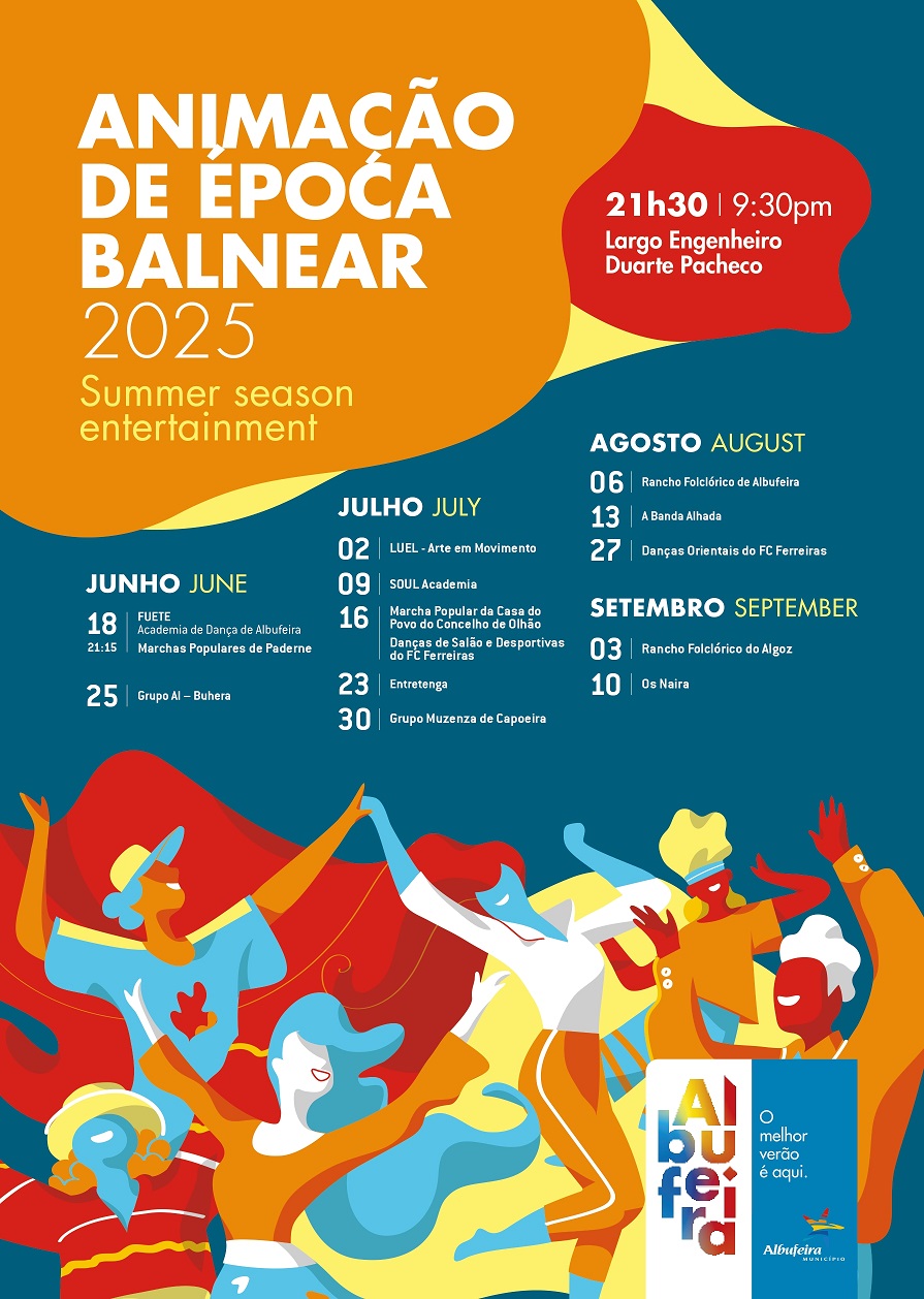 Ao longo de quase 3 meses, o Largo Eng.º Duarte Pacheco vai acolher mais de uma dezena de eventos, sempre com início pelas 21h30. A programação inicia já no próximo dia 18 de junho, com a atuação da FUETE – Academia de Dança de Albufeira, e das Marchas Populares de Paderne. O calendário prossegue ao longo do verão com atuações diversificadas. A fechar o mês de junho, destaque para a atuação do grupo de música tradicional portuguesa Al-Buhera (25).