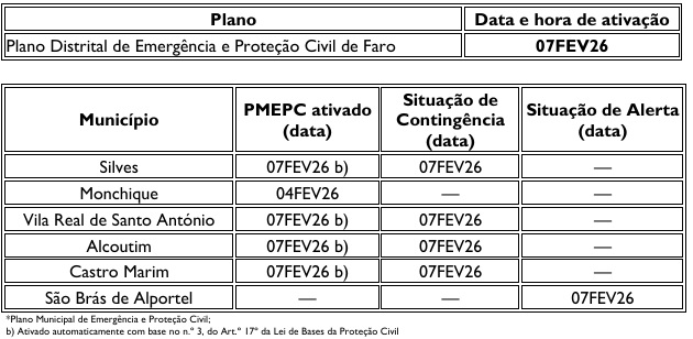 O Comando Regional de Emergência e Proteção Civil (CREPC) do Algarve da Autoridade Nacional de Emergência e Proteção Civil (ANEPC) informa que, no período compreendido entre as 12:00 horas do dia 10 e as 12:00 horas do dia 11 de fevereiro, persistindo, na região do Algarve condições meteorológicas adversas caracterizadas por precipitação, vento moderado a forte e agitação marítima.