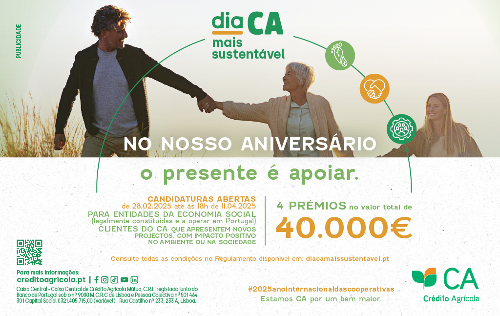 O Crédito Agrícola assinala a data do seu 114º aniversário com o lançamento da 5ª edição da campanha “Dia CA Mais Sustentável” apoiando quem se dedica a melhorar o presente e a construir um futuro mais sustentável.