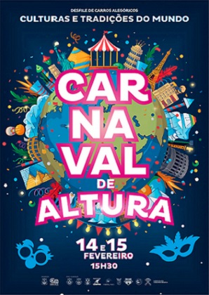 A edição deste ano do Carnaval de Altura, que decorre nos dias 14 e 15 de fevereiro, terá como tema “Culturas e Tradições do Mundo”, com um desfile de carros alegóricos que sai para a rua pelas 15h30, com entrada livre.