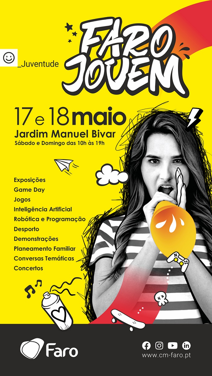 O Município de Faro volta a promover nos dias 17 e 18 de maio mais uma edição do “Faro Jovem”, uma mostra associativa que inclui várias iniciativas direcionadas para o público mais jovem, nomeadamente demonstrações, workshops, espetáculos, música, dança, tunas, jogos de consolas PS5, simuladores, realidade virtual, robótica e muito mais.