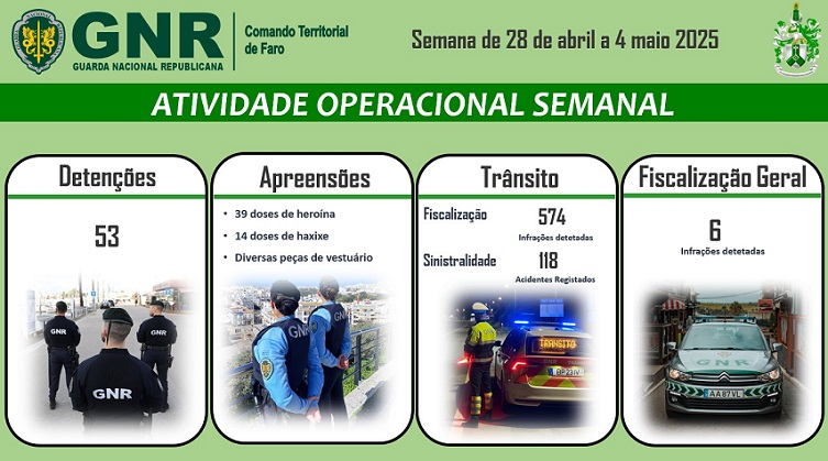 O Comando Territorial de Faro da Guarda Nacional Republicana levou a efeito um conjunto de operações no distrito de Faro, na semana de 28 de abril a 4 de maio, que visaram a prevenção e o combate à criminalidade violenta, fiscalização rodoviária, entre outras, registando os seguintes dados operacionais: