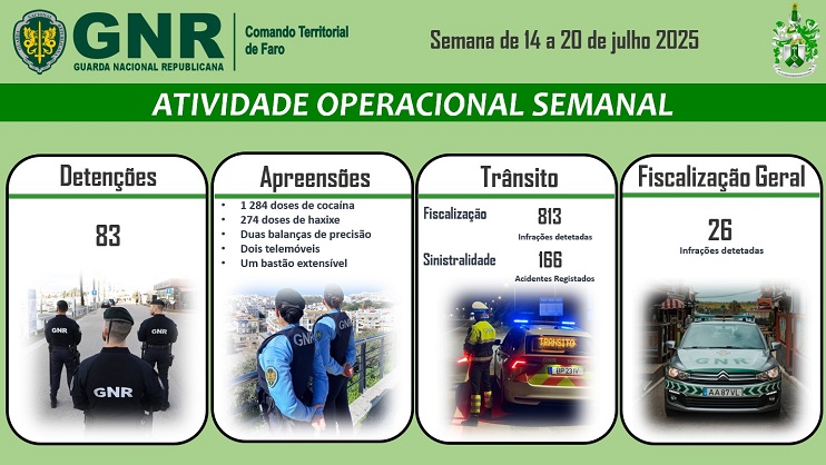 O Comando Territorial de Faro da Guarda Nacional Republicana levou a efeito um conjunto de operações no distrito de Faro, na semana de 14 a 20 de julho, que visaram a prevenção e o combate à criminalidade violenta, fiscalização rodoviária, entre outras, registando os seguintes dados operacionais:
