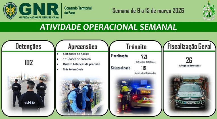 O Comando Territorial de Faro da Guarda Nacional Republicana levou a efeito um conjunto de operações no distrito de Faro, na semana de 9 a 15 de março, que visaram a prevenção e o combate à criminalidade violenta, a fiscalização rodoviária e a promoção da segurança pública, tendo registado os seguintes dados operacionais: