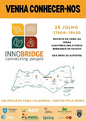 A iniciar, agora, as atividades de envolvimento da população da Serra do Caldeirão, o InnoBRIDGE convida para o primeiro evento do projeto, no dia 25 de julho, entre as 17h00 e as 19h30, em São Brás de Alportel (no recinto da Feira da Serra).