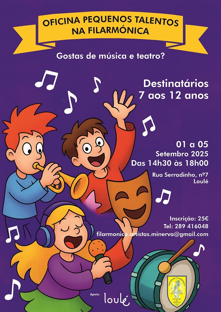 Em Loulé, de 01 a 05 de setembro de 2025, a Sociedade Filarmónica Artistas de Minerva, realiza mais uma oficina de música dirigida a participantes com idades entre os 7 e os 12 anos tendo como objetivo principal, o conhecimento e execução de vários instrumentos musicais de sopro e percussão, através do divertimento, com destaque para os que fazem parte de uma banda filarmónica e como complemento a expressão corporal e rítmica.