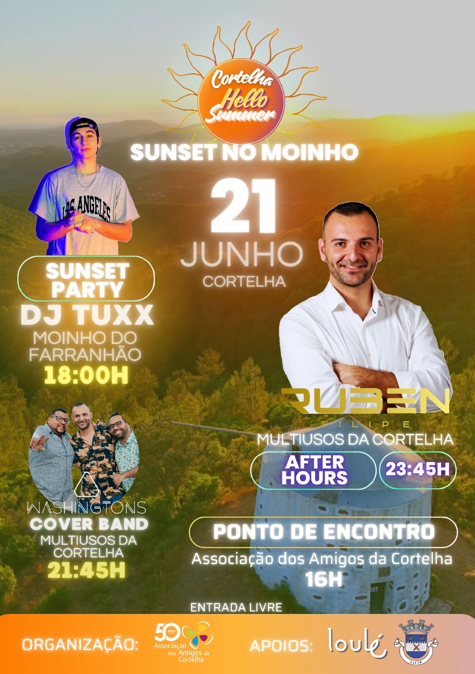 Pelas 18h00 terá lugar um esplendor e brilhante Sunset no Moinho, onde o DJ Tuxx irá proporcionar um ambiente relaxante e de pleno contacto com a natureza e onde o por do sol terá um papel principal. Já no Pavilhão Multiusos da Cortelha e pelas 21h45 subirá ao palco Washingtons Cover Band, para depois das 23h45 começar um bombástico “After Hours” com Ruben Filipe.