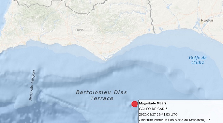 O Instituto Português do Mar e da Atmosfera informa que no dia 27-01-2026 pelas 23:41 (hora local) foi registado nas estações da Rede Sísmica do Continente, um sismo de magnitude 2.9 (Richter) e cujo epicentro se localizou a cerca de 50 km a Sul-Sudeste de Olhão.