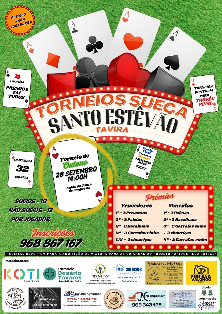 A Associação 1597 vai realizar no próximo domingo, 28 de setembro, a partir das 14h, o Torneio de Outono dos Torneios de Sueca de Santo Estêvão, no Salão da Junta de Freguesia de Santo Estêvão, concelho de Tavira.