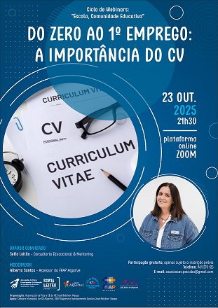 A Associação de Pais e Enc. Educação do Agrupamento de Escolas José Belchior Viegas (APEEAEJBV) de São Brás de Alportel promove, dia 23 de outubro de 2025, às 21h30, na plataforma Zoom, o webinar gratuito “Do Zero ao 1º Emprego: A importância do CV”, integrado no Ciclo de Webinars “Escola, Comunidade Educativa”.