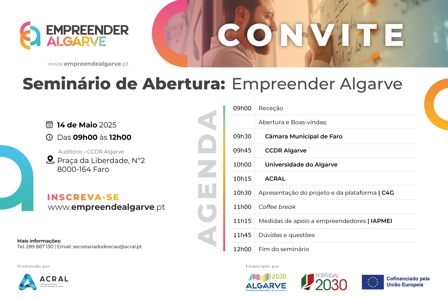 O projeto Empreender Algarve inicia oficialmente o seu percurso com o Seminário de Abertura, que terá lugar no próximo dia 14 de maio de 2025, entre as 09h00 e as 12h00, no auditório da CCDR Algarve.